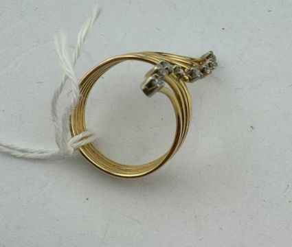 Jewellery: A yellow metal and diamond floral spray ring, the band composed of four wires terminated in diamonds, around a central wire band. Unmarked, tests as 9ct gold. UK size M½, 3.7g.