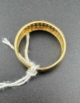 Jewellery: A yellow metal ring, marked '18C' and testing as such, set with three rows of graduated diamonds to a bark effect ground. UK size O, 4.0g.