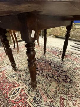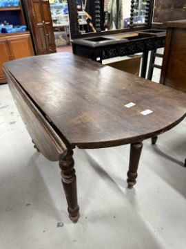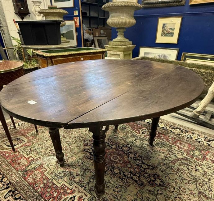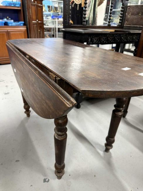 Furniture: Oval table, late 19th century of pine construction throughout. On turned legs, winged sides drop to form a serving table. Overall size 130cm x 107cm, closed size 130cm x 51cm.