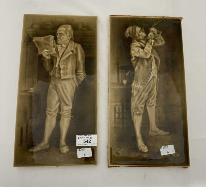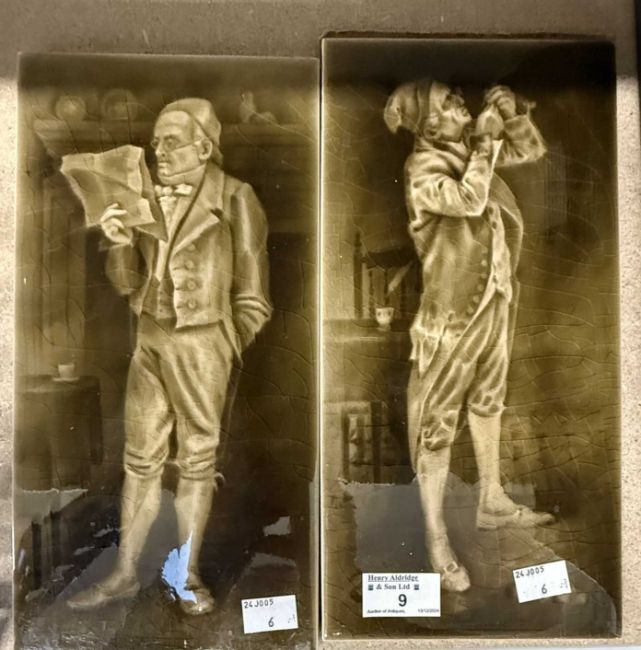 Decorative Arts: 19th cent. Glazed English majolica tiles depicting a Dickens character, possibly Mr Micawber in his study, likely produced by Sherwin & Cotton, Staffordshire, a pair. 30cm x 15cm.