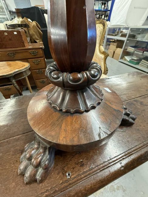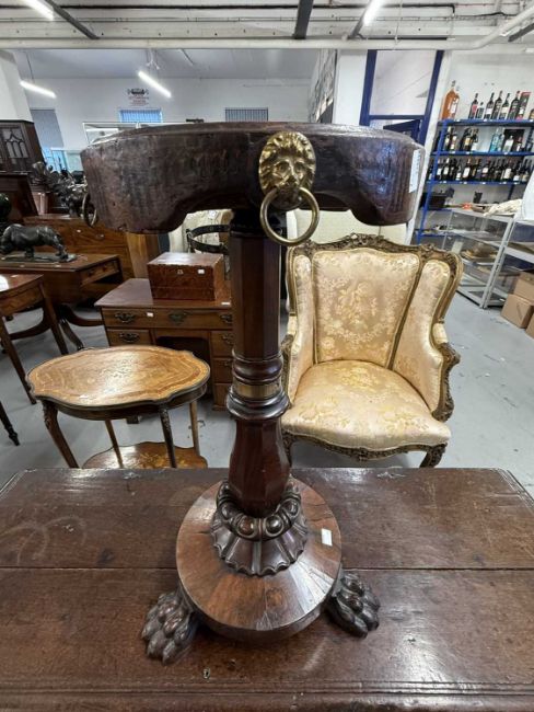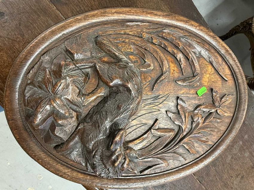 Furniture: 19th-century rosewood Jardiniere, toned on lion supports plus oval carved oak fox plaque 48cms