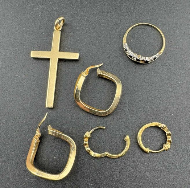 Jewellery: A 9ct gold cross pendant, 4.3cm high, a pair of 9ct gold earrings, and a 9ct gold ring, total weight 8.3g; together with a pair of silver gilt earrings.