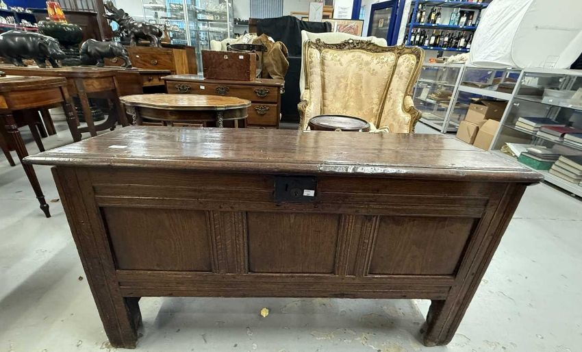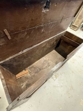 Furniture: 17th century oak peg jointed coffer three panel front, wire hinges, two plank, two single plank rear 9cm plank front supports.