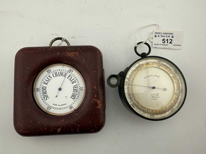 Scientific Instruments: An early 20th century compensated pocket barometer/ altimeter by J.Hicks of London, with magnifier lens for accurate reading, 7.5cm; together with a chrome plate cased London made pocket barometer in leather travel case.