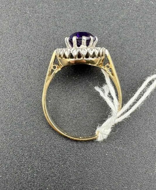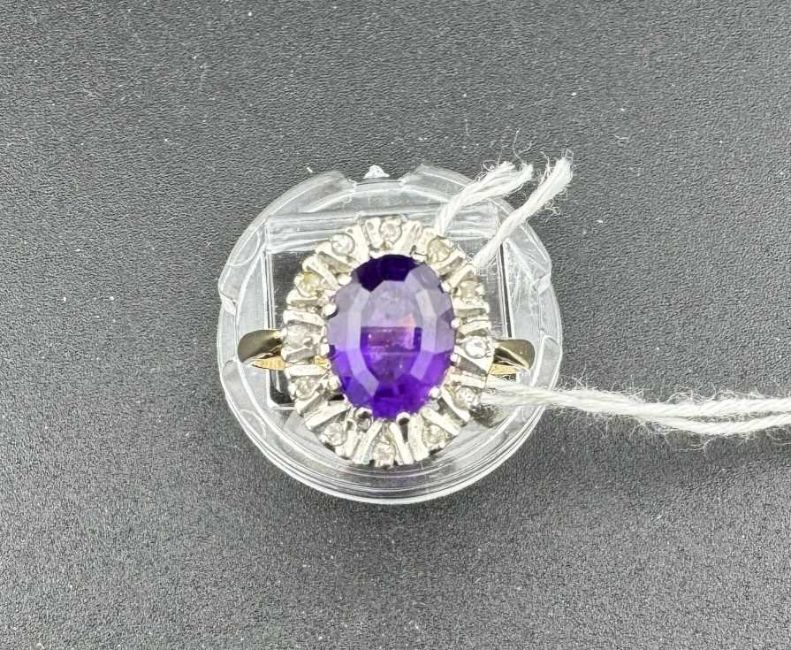 Jewellery: A 9ct gold ring, set a central amethyst in a raised mount above a halo of small diamonds. UK size P, 3.4g.