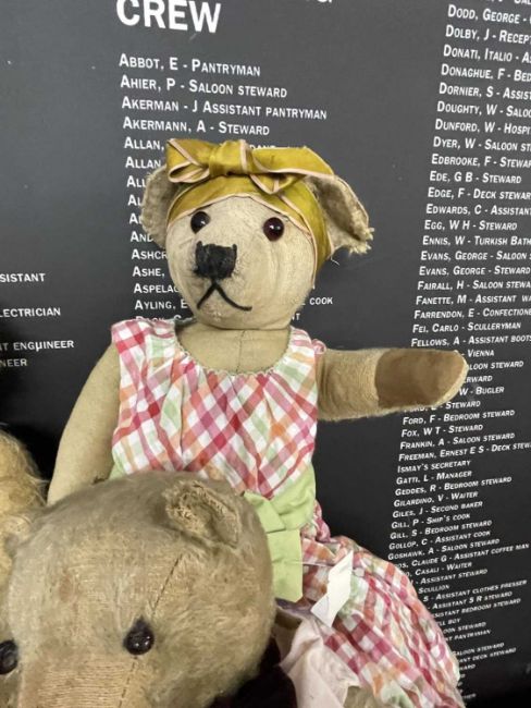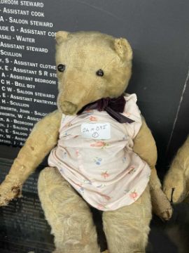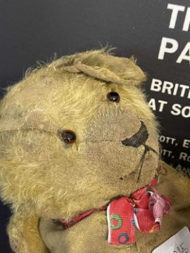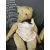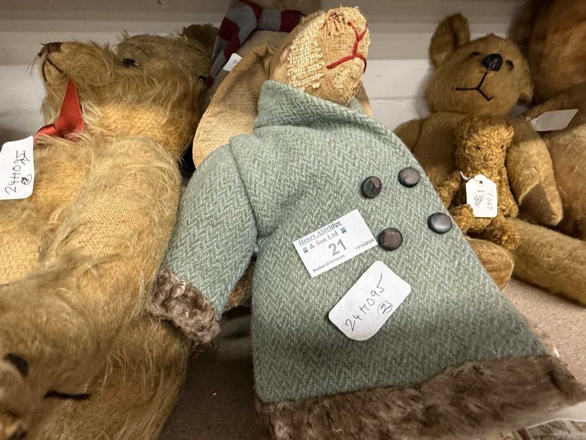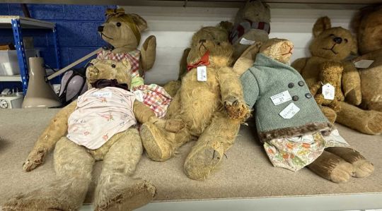 Toys: A group of three early 20th century c1930-50 teddy bears, British, two Farnell and one Merrythought, straw-filled articulated arms and legs, long snouts, all with age-related wear, dressed in later textiles.A group of three early 20th century straw-filled dolls/teddies, all British. One straw-filled rabbit doll, one plush mohair Chad Valley teddy bear with one ear missing and a straw-filled seated dog doll with both ears missing, all with age-related wear.