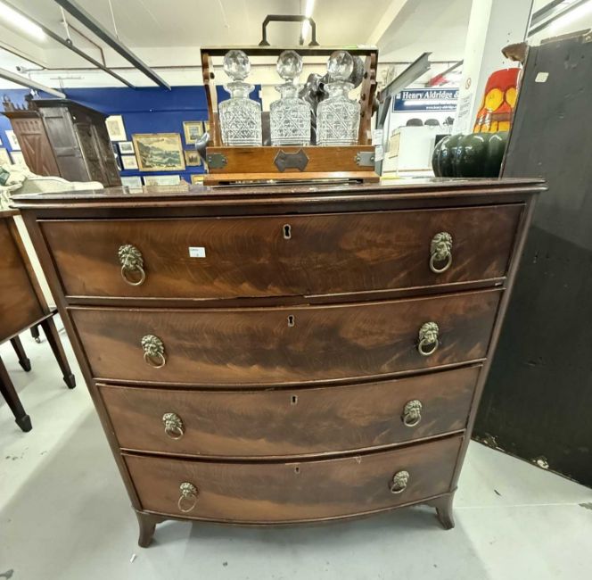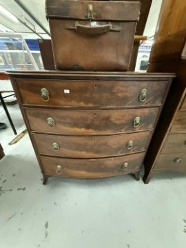Furniture: 19th century mahogany bow fronted chest of drawers four long graduated drawers rising on splayed supports. 98cm x 100cm x 53cm.