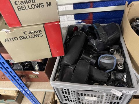 Photographic Equipment: A selection of SLRs including Minolta Canon AL1, Canon AE-1, EOJ 300, Canon Autobellows, etc.