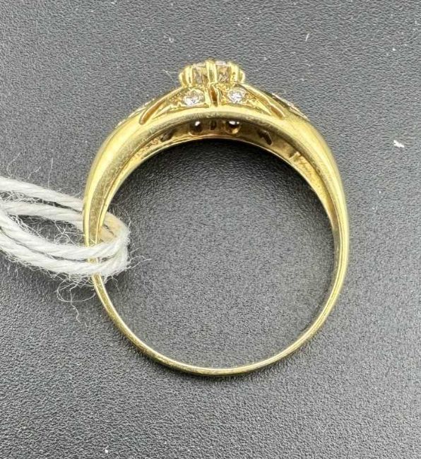 Jewellery: An 18ct yellow gold ring, a central 20 point diamond within a frame of 12 small claw set diamonds. UK size L, 2.6g.