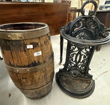 Furniture: 19th century oak coopered barrel (Firkin size) brass bound. 51cm tall. Plus a 19th century cast iron stick stand Colebrookdale style. 73cm tall.