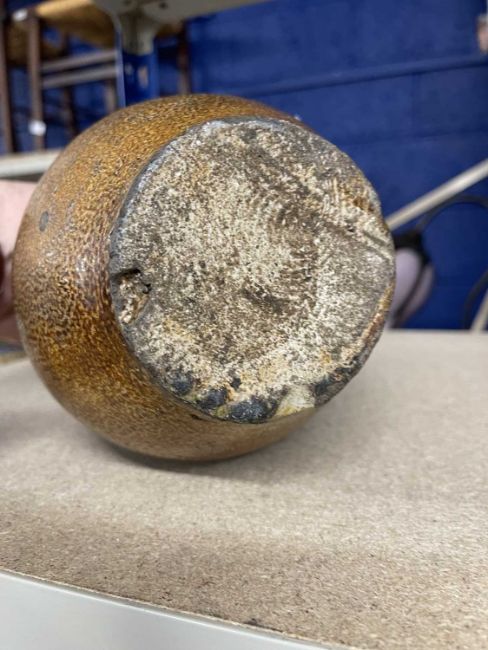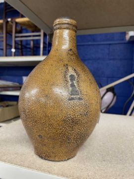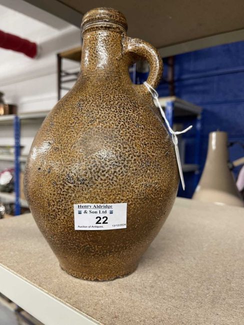 Ceramics: A 17th/ 18th century bellarmine type jug, with tiger ware style salt glaze. Missing seals. 24.5cm high.