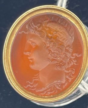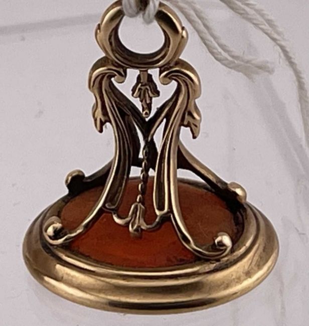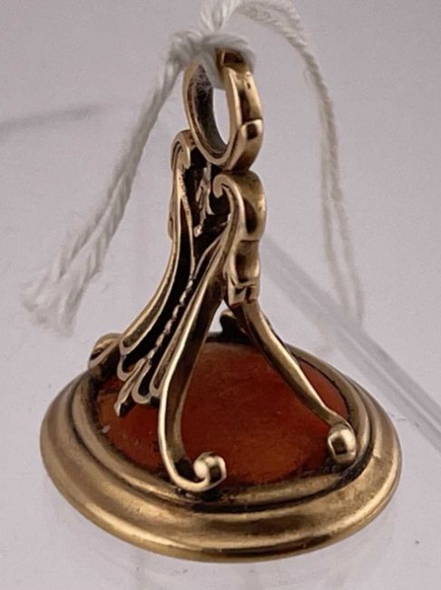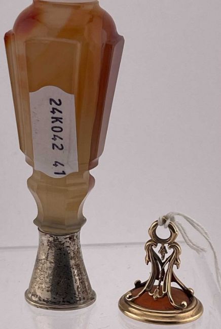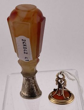 Objects of Vertu: A yellow metal openwork fob seal, tests as gold, set an oval carnelian carved with the image of a young Greek man, gross weight 8.5g; together with an agate handled desk seal with white metal mount, 8.6cm.