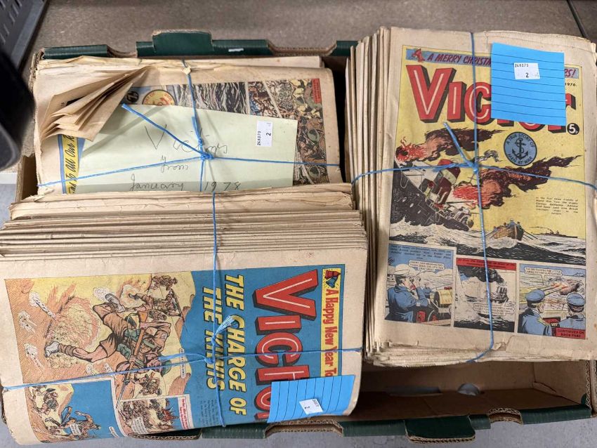 Comics 1970s: Three tied-up bundles of Victor including January to December 1974, January to December 1976, January to December 1978 + loose various dates in the 1970s. Plus 40+ issues of Hotspur 1970s various dates, 250 + approx.