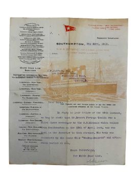 R.M.S. TITANIC: Ernest Tomlin Collection. Original letter from The White Star Line Passenger Department dated May 23rd 1912, on ghosted stationery showing Olympic in the background. It replies to the letter of 15th May and confirms Ernest was a Third-Class Passenger and was buried at sea after his recovery by the Mackay-Bennett.