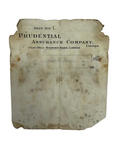 R.M.S. TITANIC: Ernest Tomlin Collection. Prudential Insurance Company agents note, recovered from Ernest’s body and bearing signs of water immersion and damage, 5ins x 6ins.