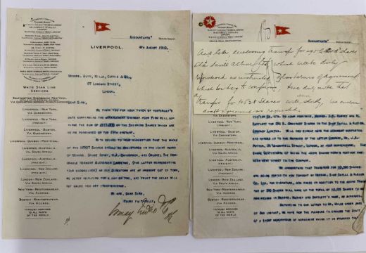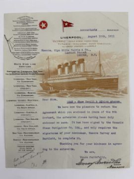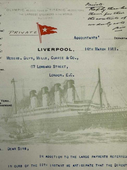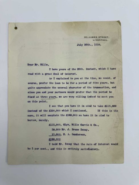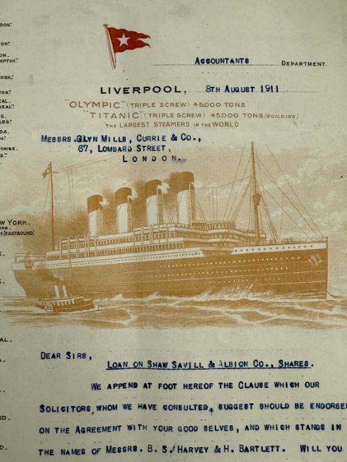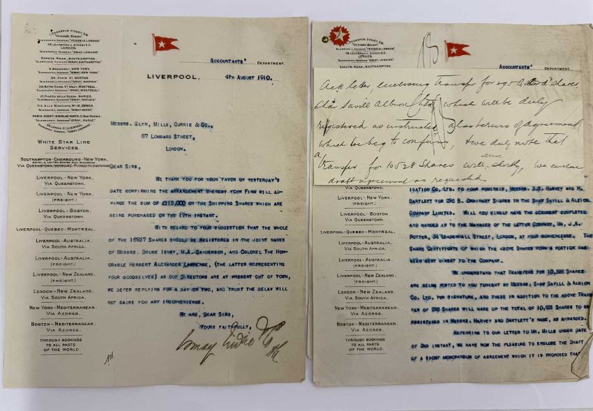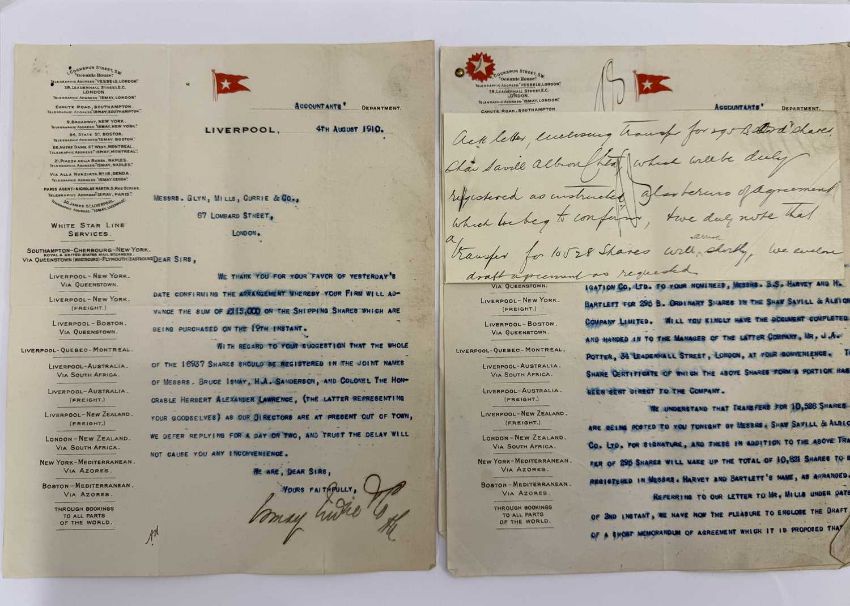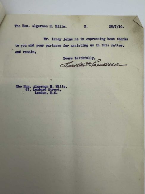 WHITE STAR LINE: A fascinating archive of official correspondence dating from July 1910 for a loan of £115,000 to The White Star Line. The archive includes three letters on Titanic/Olympic ghosted company stationery, the original contract signed by Harold Sanderson on behalf of The White Star Line. The archive numbers fourteen letters in total on White Star stationery and shows the internal mechanics behind the loan. Interestingly the early parts cover the period of the construction of Titanic and Olympic.