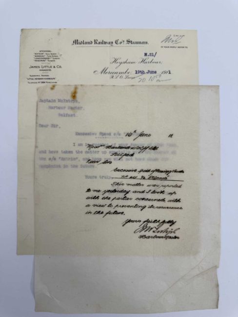 R.M.S. TITANIC: Rare pair of handwritten notes dated June and July 1911 to Harland and Wolff relating to excessive speeding of vessels past No. 401 S.S. Titanic from the Harbourmaster. (4)