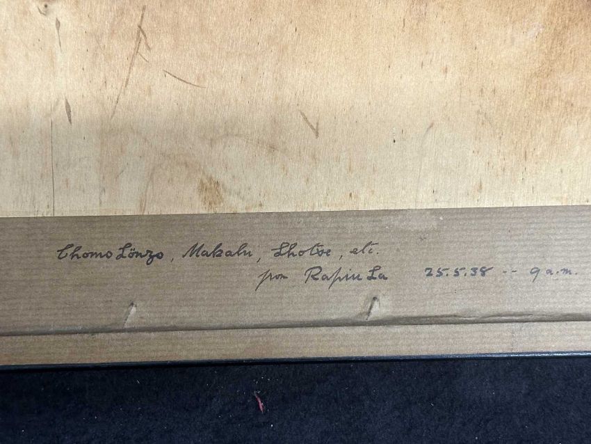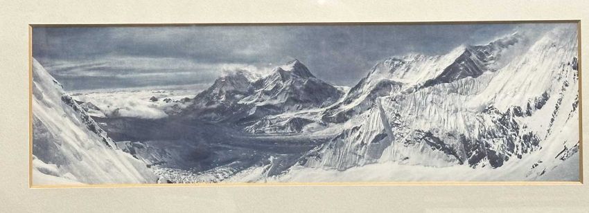 THE NOEL ODELL COLLECTION: Exceptional original panoramic photograph taken by Noel on the famous 1938 Everest Expedition showing Chomolungma, Makalu, Lhotse on the 25th May 1938 at 9am. The 1938 expedition was led by Bill Tilman and attempted the ascent via the North Col but making an attempt from the west, from the main Rongbuk Glacier, as well as from the East Rongbuk. The North Col was reached from the west for the first time and the team went on to over 8,290 m (27,200 ft) without supplemental oxygen before being forced down by bad weather and sickness. 50cm x 15cm.