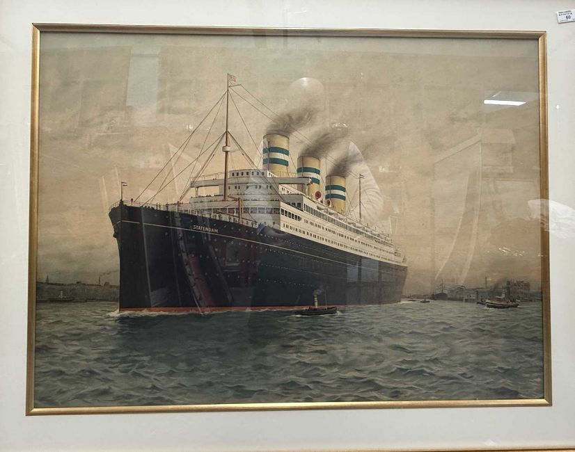MARITIME: Holland America Line (NASM) circa 1914 rare agents colour lithograph of the pre-WWI intended company flagship S.S. Statendam built by Titanic builders Harland and Wolff she would never see active passenger service being requisitioned to Britain as a troop ship S.S. Justica, which would go on to be sunk in January 1918 by two U-boats. 40ins x 49ins.