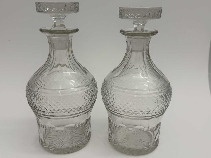 WHITE STAR INTEREST: 20th century crystal decanters with stoppers bearing later applied burgee, with Stuart Crystal marks to base, a pair, 27cm.NB These items are for decorative use only. They are replicas and not original White Star Line pieces.