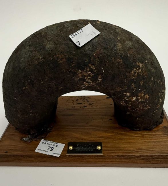 OCEAN LINER: A segment of a link from the stern anchor chain of the Queen Elizabeth 2. The link was found to be damaged when the chain was examined while the vessel was in drydock at Bremerhaven in Nov/Dec 1983. The segment is mounted on a wooden base with a brass plaque. Copies of some documentation associated with the anchor chain is included. Plus a framed print of Sir Samuel Cunard believed to have been copied from an oil painting dated 1859. From the collection of Commodore R. W. Warwick. Overall measurement 16ins x 20ins.