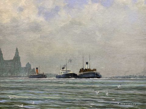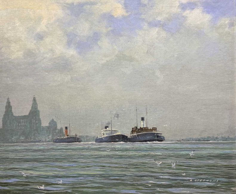 MARITIME: Ferry Interest 'The Last Journey', 'Claughton' and 'St. Hilary' ex- Royal Daffodil II departing the Mersey as 'dead' ships on route to the breakers, original oil painting dated August 1962, signed by Roy Stephens, 24ins x 27ins.