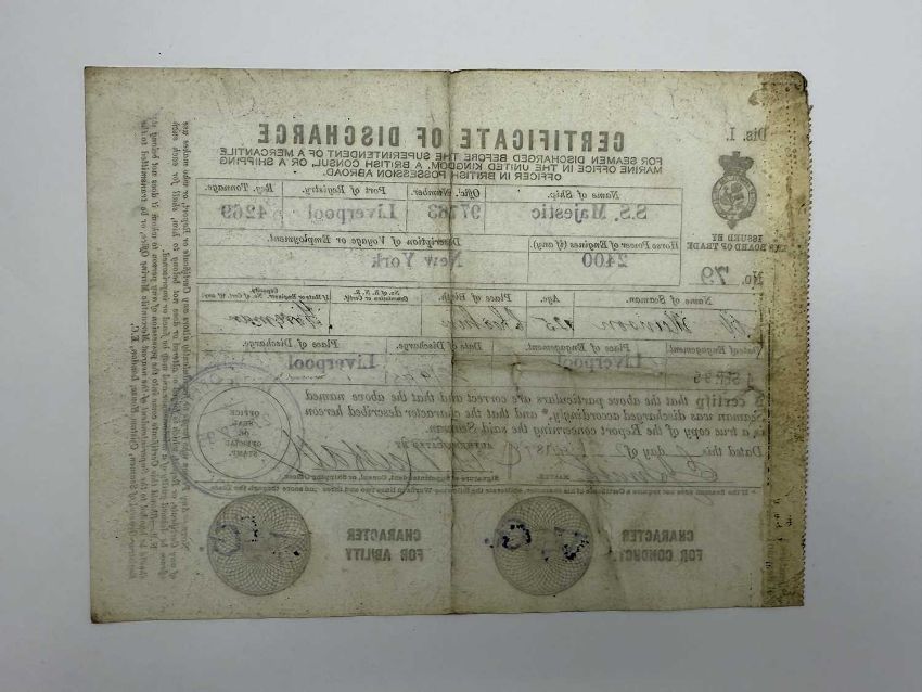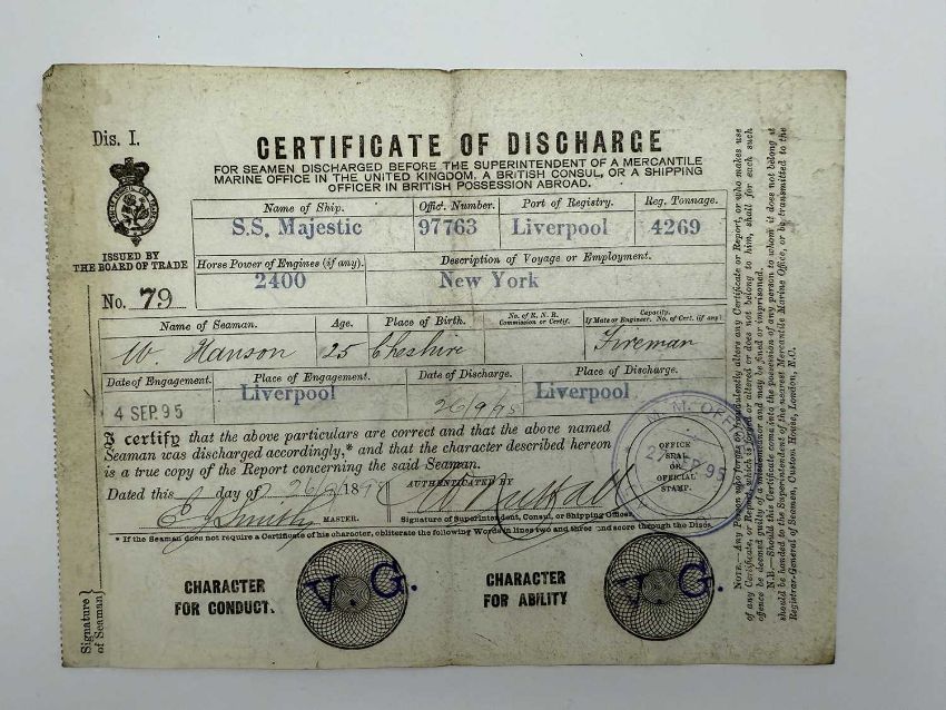 WHITE STAR LINE: Certificate of Discharge signed by Titanic's Captain Edward J. Smith for a crewman on the Majestic dated September 1895.