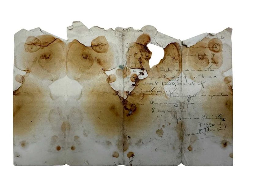 R.M.S. TITANIC: Ernest Tomlin Collection. Handwritten note by Ernest bearing significant signs of water immersion that was recovered from his pocket book that travelled on Titanic with him, the note is signed “Yours in Christian Fellowship Ernest Tomlin”. 9ins x 5ins.