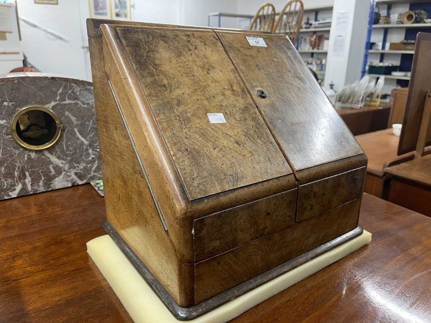 Writing Requisites: 19th century figured walnut stationery box with drawer beneath and perpetual calendar, multiple letter racks, 15ins x 14ins x 11ins.