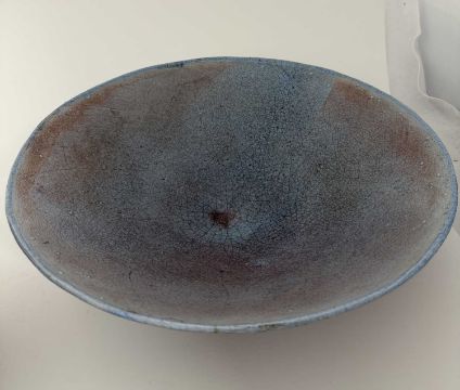 * Stephen Murfitt (born 1953): flaring raku bowl covered in a crackled lavender and red glaze, and a raku vase by Stephen Murfitt impressed seal mark, hairline crack to rim of bowl, 35cm diameter (bowl) (2)Provenance Courcoux & Courcoux, Salisbury 1987NB This item may be subject to artist resale rights.