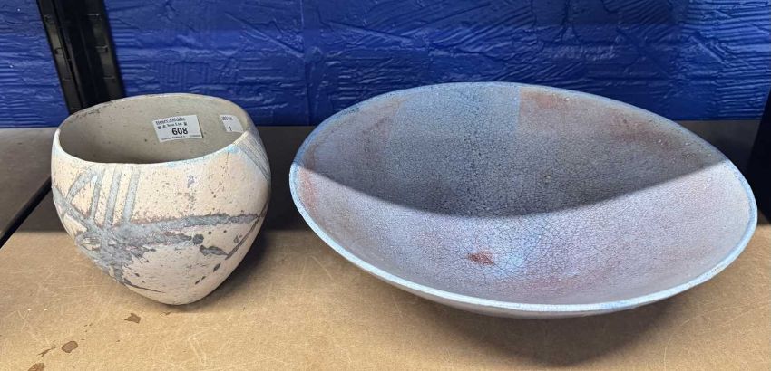 Stephen Murfitt (born 1953): flaring raku bowl covered in a crackled lavender and red glaze, and a raku vase by Stephen Murfitt impressed seal mark, hairline crack to rim of bowl, 35cm diameter (bowl) (2)