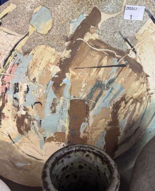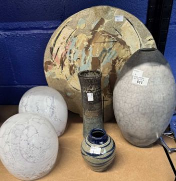 Studio Ware: Pottery vases by Nick Harris, Lotte Glob 'Far North', an unmarked round vase sandy texture, 39cm and two glass vases 'Durglass'.