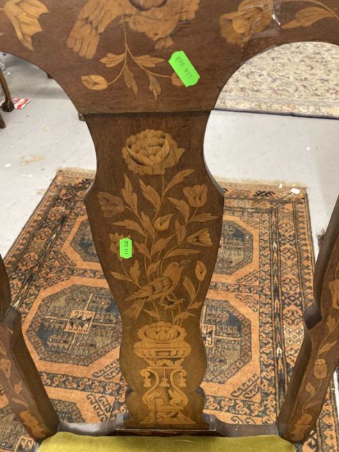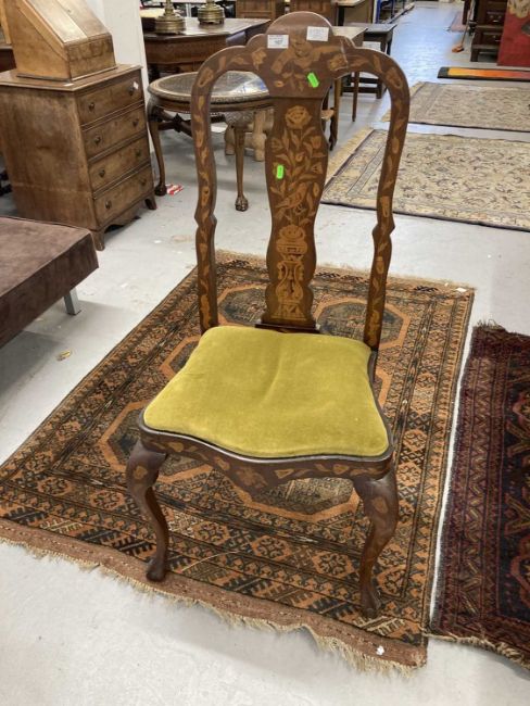 Furniture: Early 19th century red walnut side chair Dutch/Continental with inlayed stylised motifs c1800-1830, drop in seat, serpentine front rail and cabriole legs terminating on hoof feet, height 114cm, width 53cm.