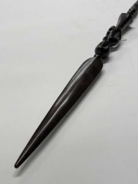 Tribal Art: East African hardwood carved staff, skirted figure below a leaf shaped blade inlaid bone eyes with ebony pupils, the shaft decorated with bands of cross hatchwork, the finial a waisted panel, good patina, height 44ins.