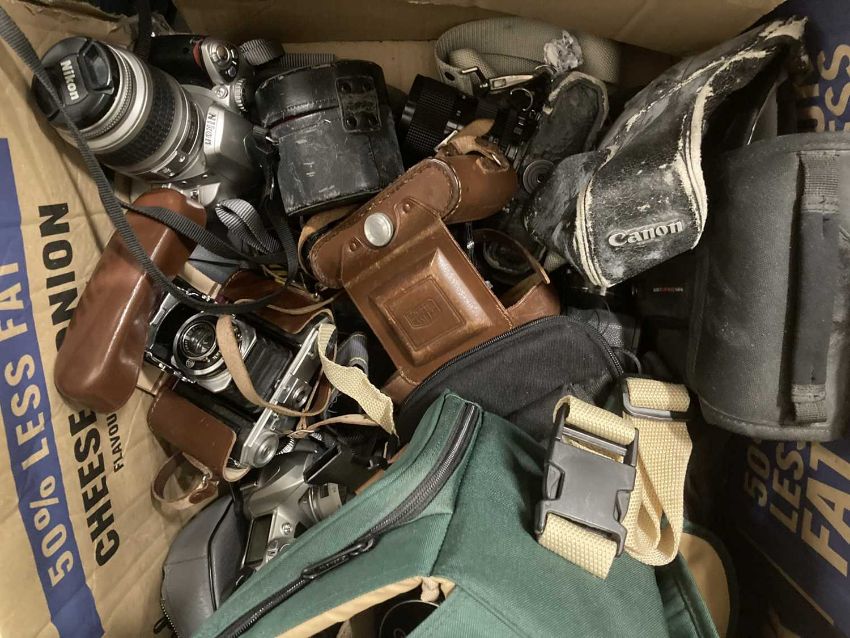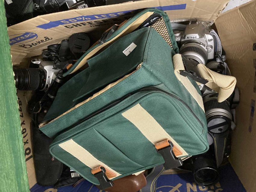Cameras: Canon WOS 500, Canon A1 35MM, 35-300MM zoom, 35-70mm, 28-8mm lenses, Nikon D40 and D50 cameras with lenses, a Nikon Macro Lumix F238 camera and lens, etc.