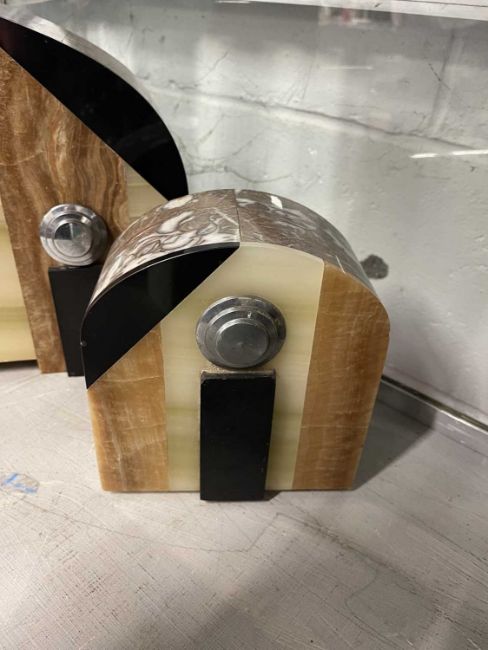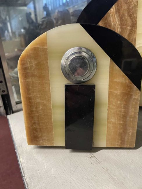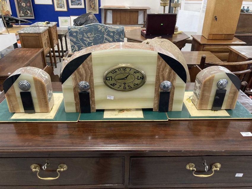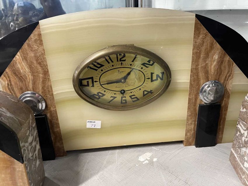 Clocks: Art Deco French marble garniture multicoloured marble and chrome dial signed Basti, Bruay en Arts.
