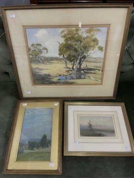 Pictures: Three landscape paintings. Watercolour depicting cows in a glade by Australian painter John Roy. Eldershaw dates 1892, sight size 45cm x 35cm. Also oil painting of a hillside scene of Nutley Sussex. Sight size 32cm x 19cm. Also includes watercolour Sluice Mill by John Inge.
