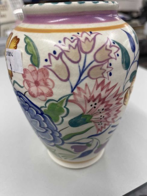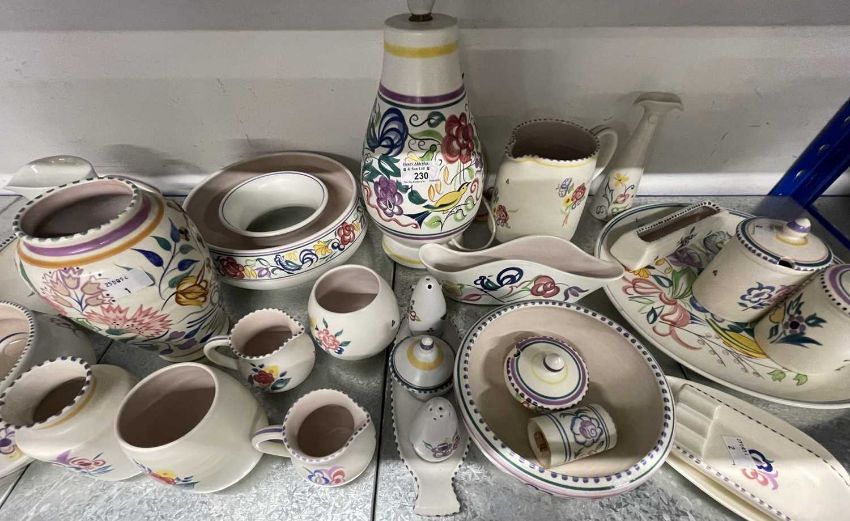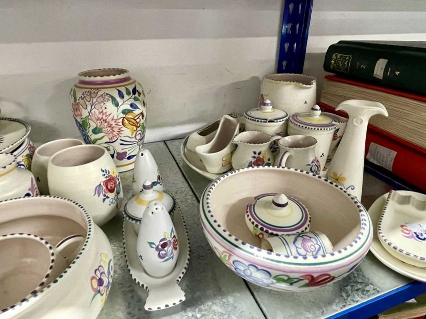 Poole Pottery: BN pattern vase by Truda Carter c1935, pink slip base with impressed Poole England and decorator's mark for Rene Hayes, 17cm. Large charger, 31cm, morning milk jug, two preserve pots, three cream jugs, posy ring, two flower troughs, 23cm plate, 24cm table lamp,, two bowls, milk jug, ashtray, condiments set, bud vase, etc. (27)