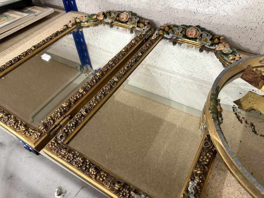 Mirrors: A Barbola triptich mirror decorated with flora, bevel edged, an oval gilt wood framed bevel edged mirror and a circular mirror.