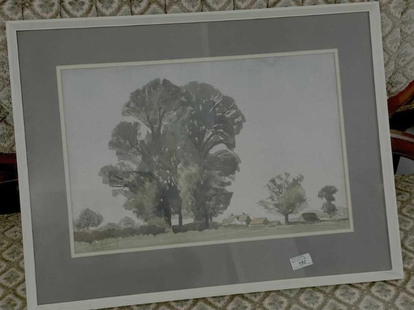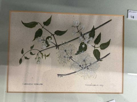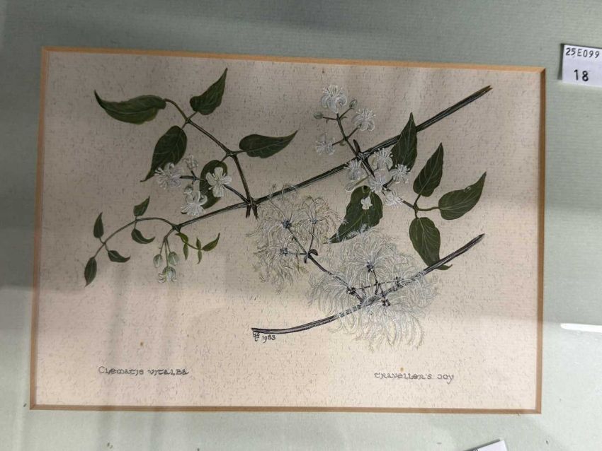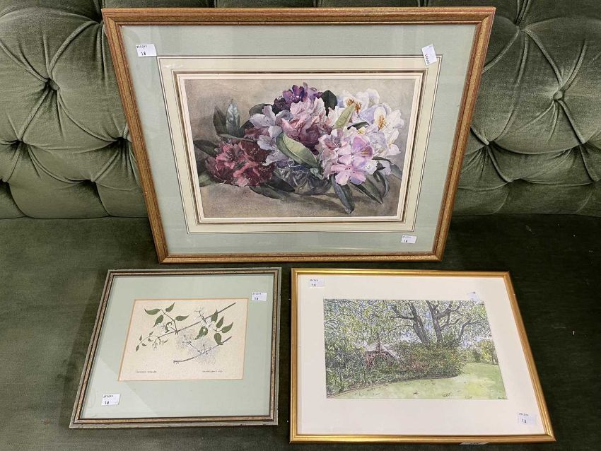 Pictures: Still life watercolour of Rhododendron in a bowl vase. Sight size 34cm x 24cm. Botanical watercolour of traveller's joy, dated 1983, a pen and watercolour garden scene. All framed under glass.