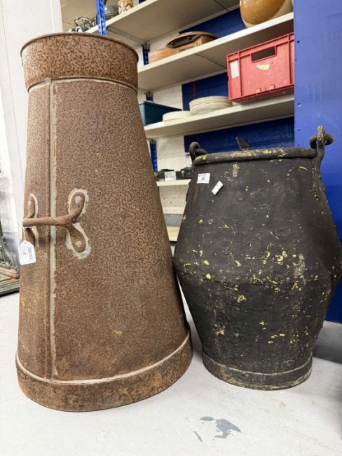 Metalware: 19th century cast iron milk churn Cooper & Sons, Bristol, 74cm high, plus a tinplate well water bucket, 50cm high.