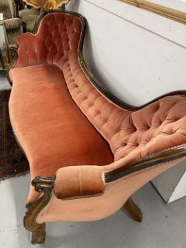 Furniture: 19th century upholstered three seater settee on carved cabriole supports.