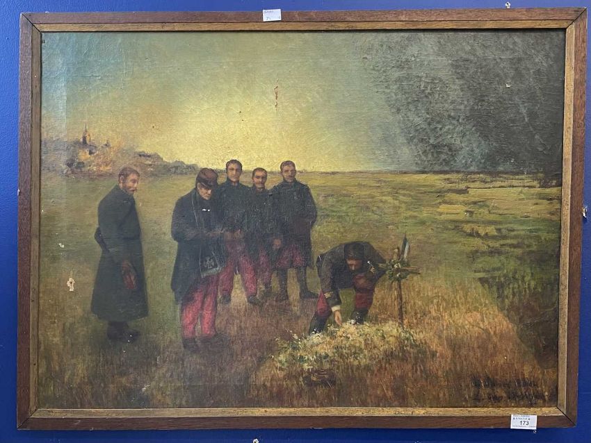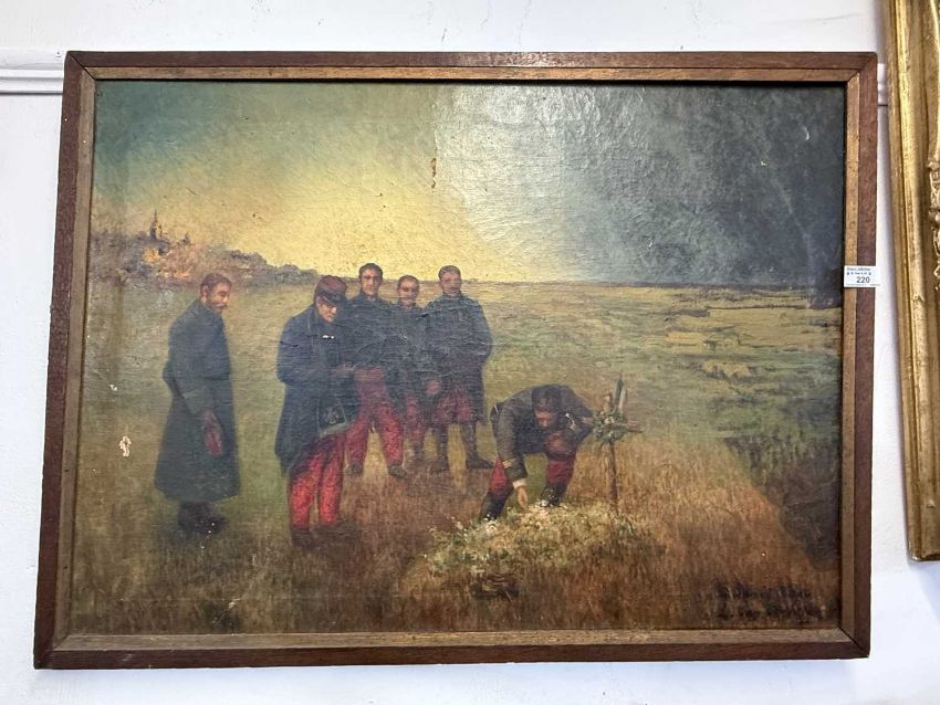 19th Century Continental School: Oil on canvas of French soldiers during the Franco Prussian War, indistinct signature bottom right, some losses, 77cm x 56cm.