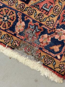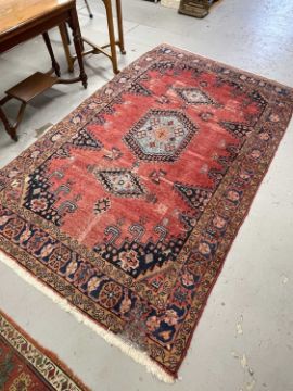Carpets & Rugs: 19th century hand knotted Persian rug, likely of nomad or village design, red ground with three central geometric medallions in blues, reds, ivories and black, all enclosed by three borders, all decorated with geometric designs, 50cm hand repair approximately 20cm from one edge, 250cm x 155cm.