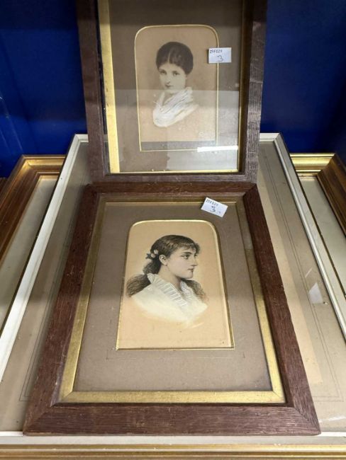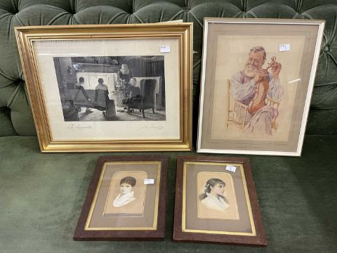 Pictures: Watercolour of violinist tuning his strings seated in a bamboo chair, 29cm x 23cm. Also, black & white watercolour by John Bloomfield, 1916 "Two Argumenters" around an Inglenook and a further two tinted portraits.