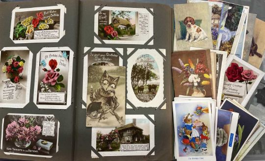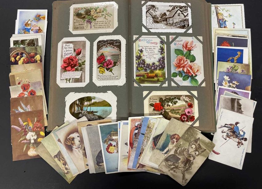 Postcards: Edwardian albums containing more than 160 cards, mainly Greetings, some silks and comic, no topographical, plus another 50 cards including approximately 20 Godfrey Phillips De Reszke cigarette postcards featuring dogs and poppies.