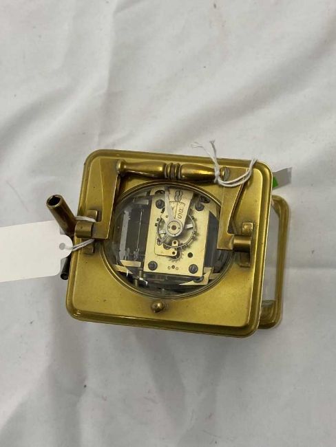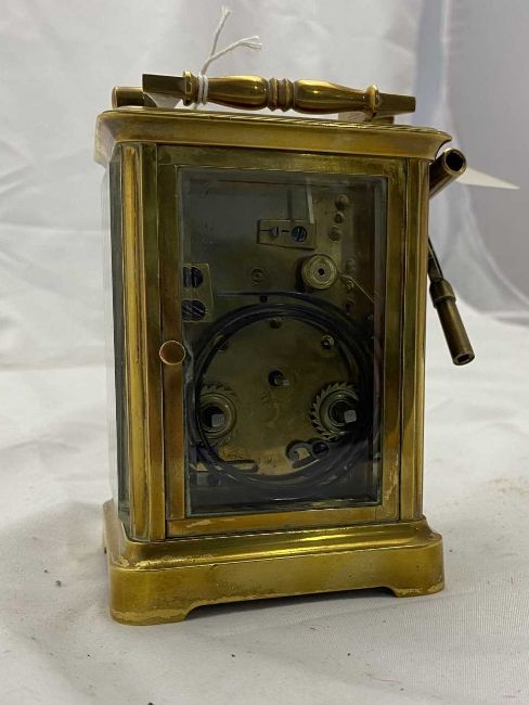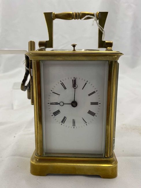 Clocks: a late 19th century brass cased half hour repeating carriage clock, retailed by Boxell of Brighton (operated from 1851 to 1878), complete with key, 16cm including handle.
