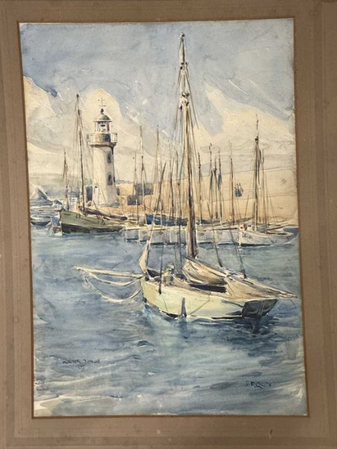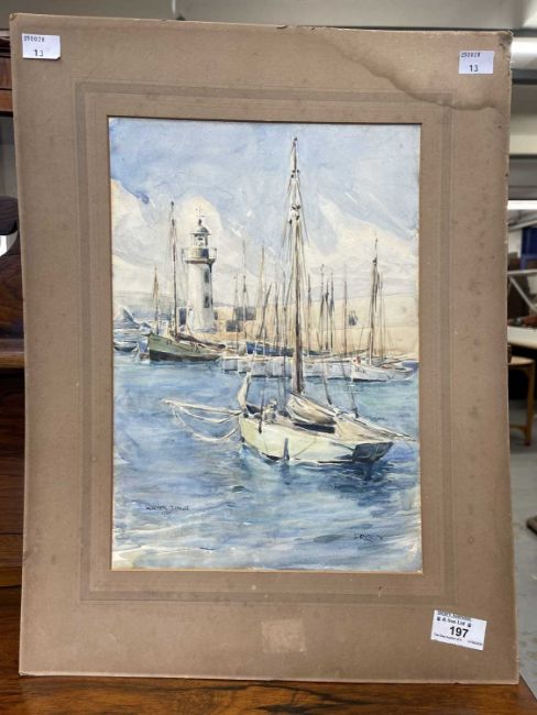 Walter Taylor (1860-1943): Watercolour maritime study yachts in harbour entitled ERQUY, signed and dated 1927 lower left, mounted but unframed, 9ins x 14ins.