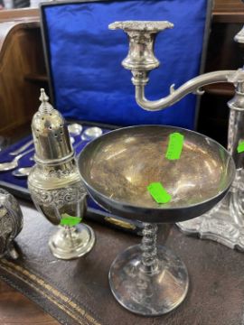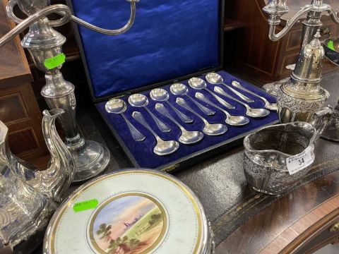 Silver Plate: Engraved and fluted teapot and associated stand, set a central porcelain panel painted with a landscape scene, 16cm; a cased set of 12 strawberry spoons; two candelabra, and other silver plated items.