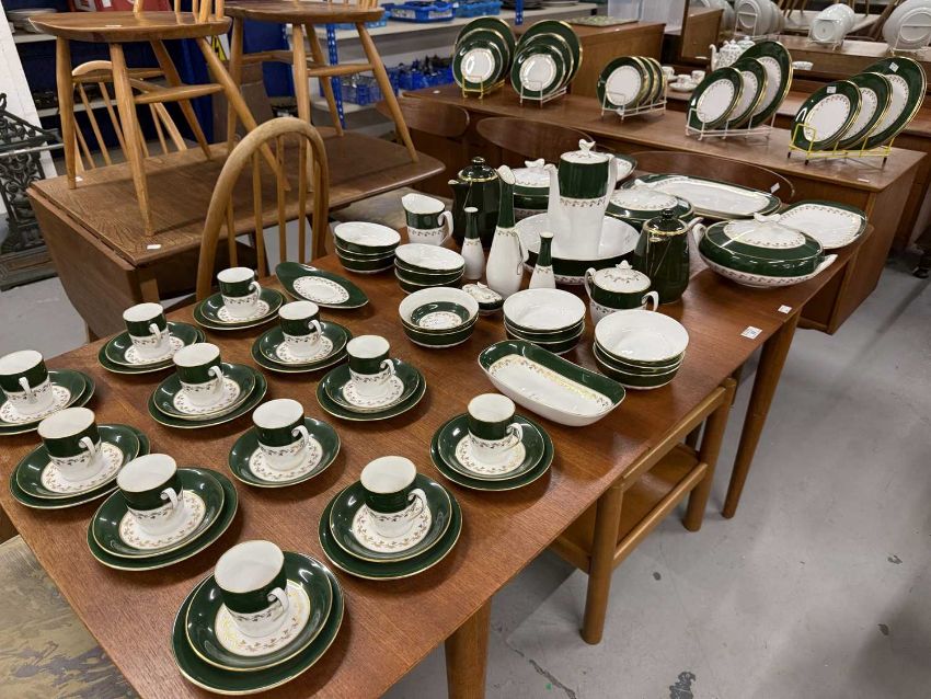 Ceramics: Spode Green Velvet dinner, tea and coffee service comprising dinner plates x 12, breakfast plates x 12, tea plates x 12, soup bowls x 12, pudding bowls x 14, meat ovals 14½ins and 13ins, vegetable tureens and covers x 3, a serving bowl, coffee pot, teapot, hot water pot, oil bottle, salt, pepper and mustard pots, sauce boat saucer, side plates x 11 cups and saucers x 12.